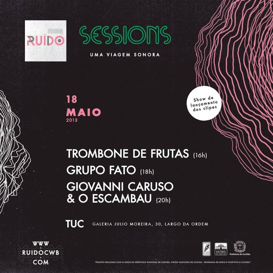 * LANÇAMENTO VÍDEOS: Mais uma edição do projeto RUÍDO SESSIONS no TUC agita a tarde de sábado! E, mais uma vez, só fera!!!! Se liguem nas bandas que estarão: GIOVANNI CARUSO E O ESCAMBAU, TROMBONE DE FRUTAS e GRUPO FATO!!!! Finíssima sonzeira!!!! Maiores informações.