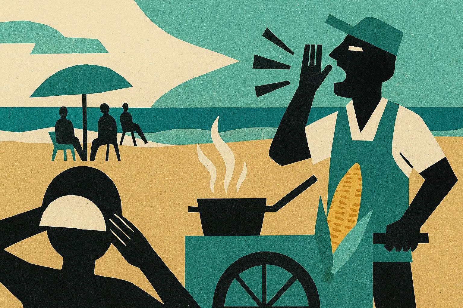 Você recostou a cabeça na areia em busca de um pouco de sossego. Mas o vendedor chega bem perto e berra: "Heineken! Corona!”. O grupo de pessoas ao seu lado, espalhado entre cadeiras e barracas, conversa gritando uns com os outros. Um vendedor acredita ter desenvolvido uma técnica de marketing infalível. Ele para seu carrinho – que tem um panelão de água fervente - no meio da areia. Depois olha em volta com uma expressão desaforada e grita: “Olha a p*rra do milho! Olha a p*rra do milho!”.