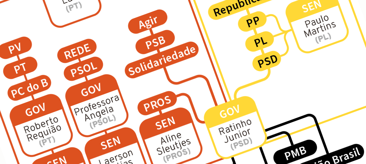 Já o PT passou longe de repetir, no Paraná, a grande aliança em torno de Lula no plano nacional. Além dos quatro partidos que estão com Ratinho Junior, o PT não conseguiu, sequer a unidade da esquerda, com a federação PSOL/Rede lançando candidatura própria ao governo, Professora Angela (PSOL), e ao Senado, Laerson Martins (PSOL). Assim, a chapa de Roberto Requião (PT) ficou restrita à federação PT/PV/PC do B.