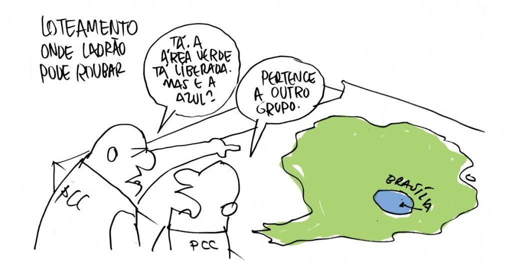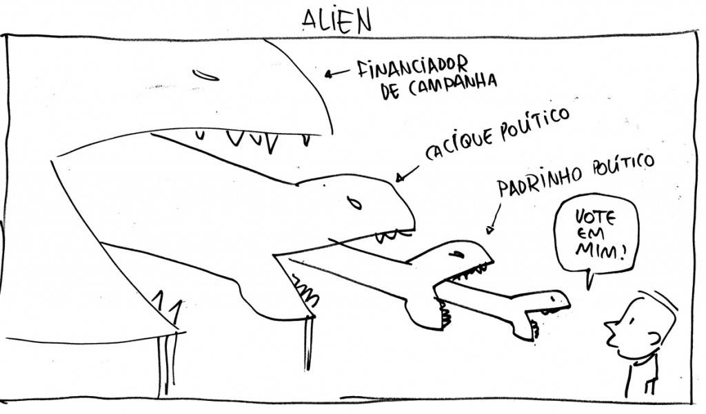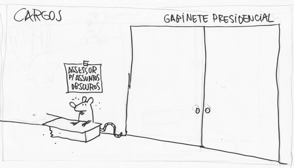 Para cada charge que sai publicada no jornal existem umas 3 ou 4 que ficam só no esboço. Sinceramente gosto mais delas desse jeito mesmo, sem as empulhações do photoshop. São mais espontâneas, talvez mais honestas. Se eu pudesse as publicaria as versões cruas, como saem no papel pela primeira vez. Assim: