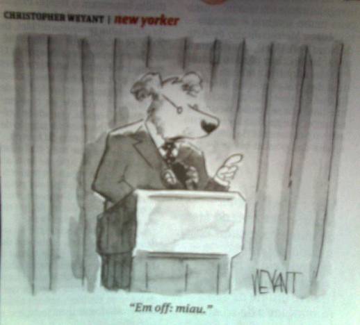Não sei o que tem de especial nesse cartum. É só um cachorro numa palestra -provavelmente para outros cães – dizendo “em off: miau”. Em um episódio de Seinfeld, quando Elaine Benes resolve se tornar cartunista porque não acha a mínima graça nos cartuns da revista The New Yorker, o editor da publicação diz que “cartuns são como teias de aranha, não podem ser dissecados”. E tentar explicar um cartum é tão de mau gosto quanto colocar os joelhos em cima da mesa durante as refeições.