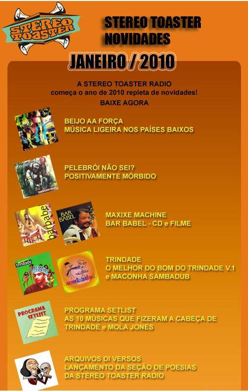 Janeiro começou bem para quem gosta de boa música local. O site Stereo Toaster disponibiliza para quem quiser os downloads de bandas como Beijo AA Força (disco “Música ligeira nos países baixos”, um dos melhores de todos os tempos no Paraná), Maxixe Machine, Pelebrói Não Sei, Trindade e outras. Veja a relação no flyer abaixo: