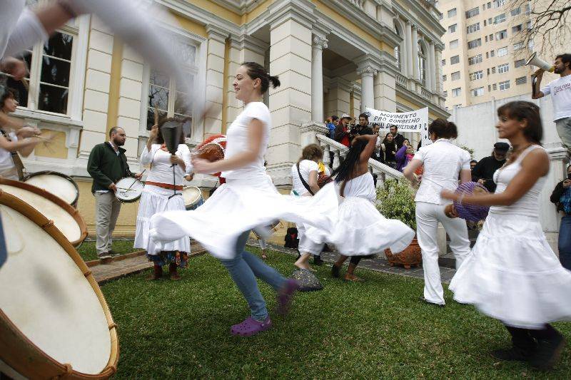 Grupo de artistas dança maracatu em frente à sede da Secretaria da Cultura do Paraná