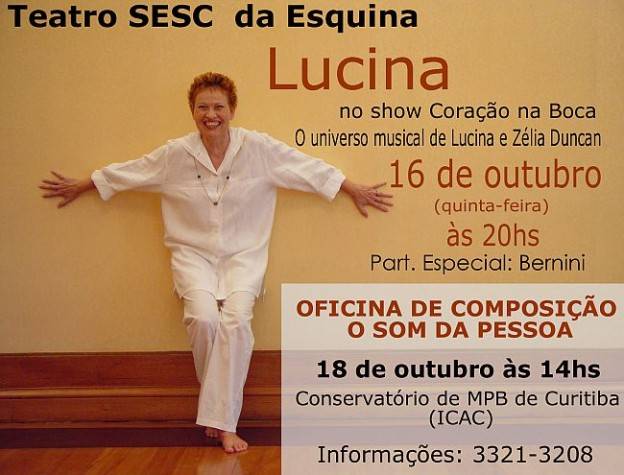Lucina estará em Curitiba nesta semana para um show, no Teatro Sesc da Esquina e uma oficina de composição no Conservatório de MPB de Curitiba, em que pretende agitar a criatividade de quem se inscrever.