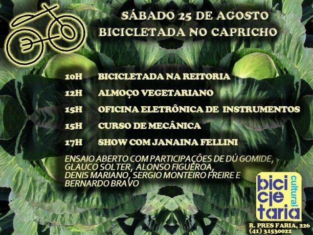 Neste sábado, dia 25 de agosto, a cantora Janaína Fellini faz ensaio aberto na Bicicletaria Cultural mostrando o repertório do seu primeiro disco, que começou a ser lançado com um single semanal pelo site Musicoteca.