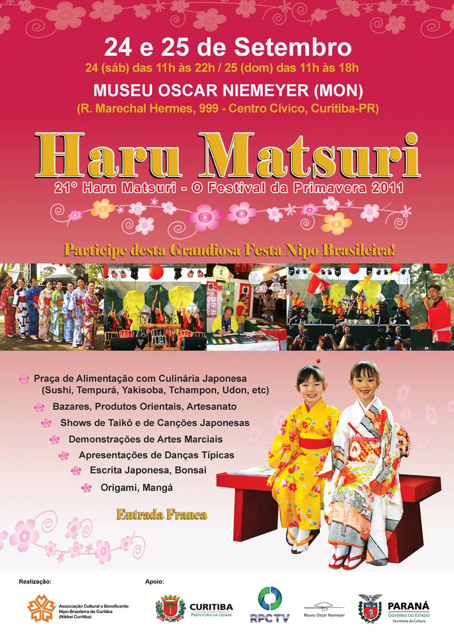 Dejamos aquí una indicación de Denize para este fin de semana: ella ha estado siguiendo nuestro blog. El Haru Matsuri es un festival japonés que tiene lugar hace dos décadas en Curitiba y conmemora el comienzo de la primavera. El evento tendrá lugar el sábado y el domingo en el Museo Oscar Niemeyer en Curitiba. Allá se puede disfrutar de la comida japonesa, es posible comprar productos de la etnia y disfrutar de la cultura oriental – con espectáculos de danza, música y artes marciales.
