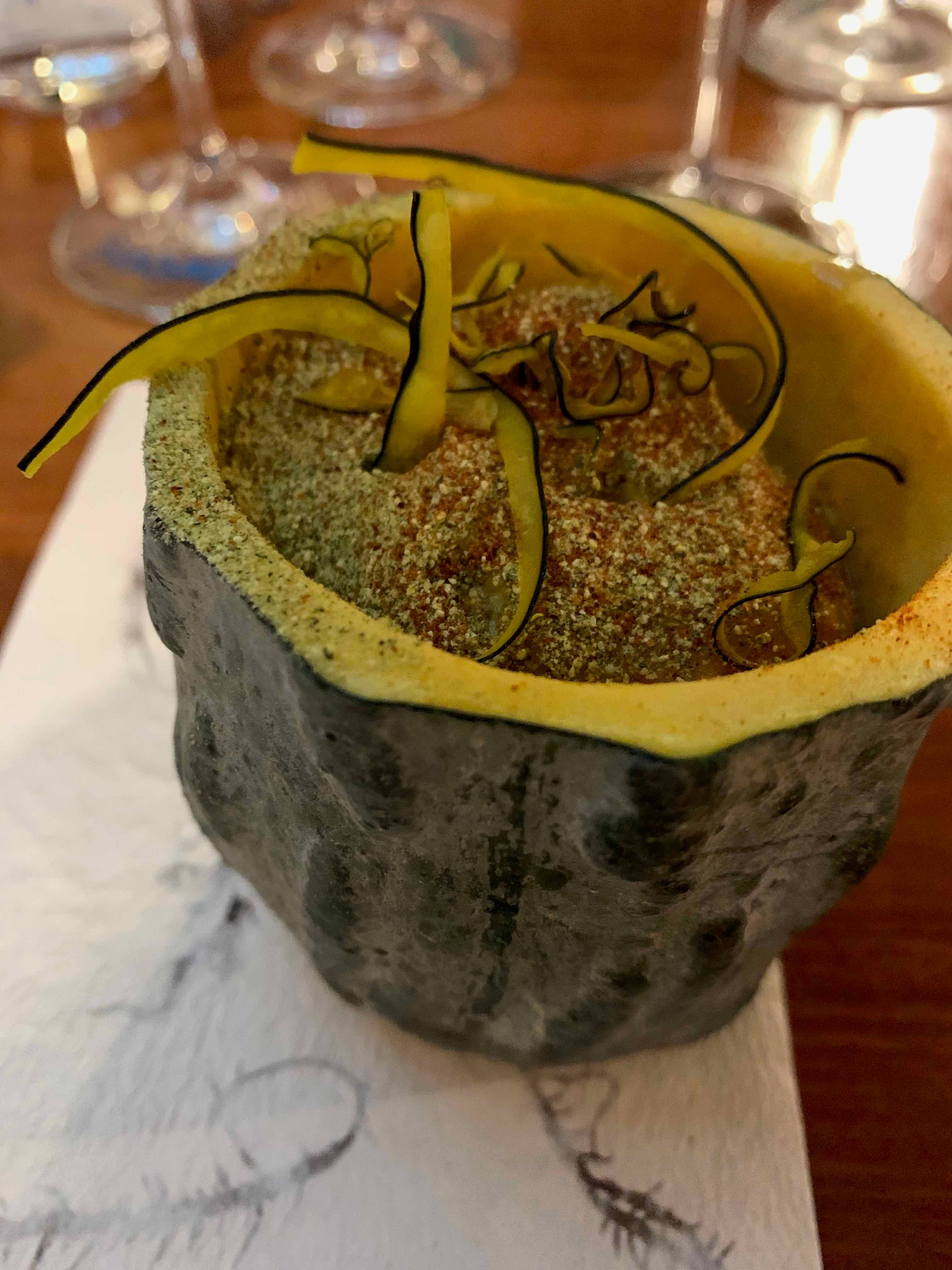 Namorado, pirão de camarão, raiz de salsão e castanha